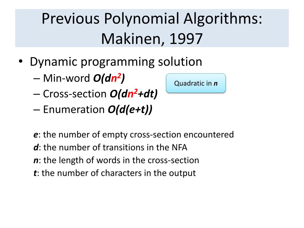 Previous Polynomial Algorithms: Makinen, 1997 • Dynamic programming solution • Min-word O(dn2) • Cross-section O(dn2+dt) • Enumeration O(d(e+t)) e:the number of empty cross-section encountered d: the number of transitions in the NFA n: the length of words in the cross-section t:the number of characters in the output Quadratic in n