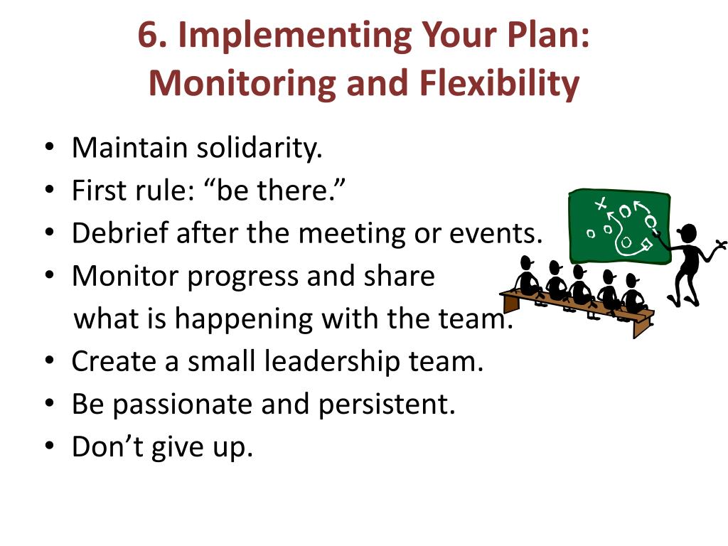 6. Implementing Your Plan: Monitoring and Flexibility • Maintain solidarity. • First rule: “be there.” • Debrief after the meeting or events. • Monitor progress and share what is happening with the team. • Create a small leadership team. • Be passionate and persistent. • Don’t give up.