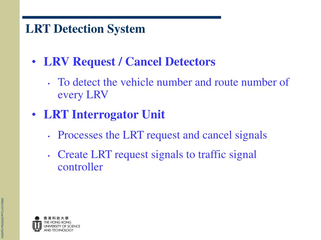 LRT Detection System • LRV Request / Cancel Detectors • To detect the vehicle number and route number of every LRV • LRT Interrogator Unit • Processes the LRT request and cancel signals • Create LRT request signals to traffic signal controller