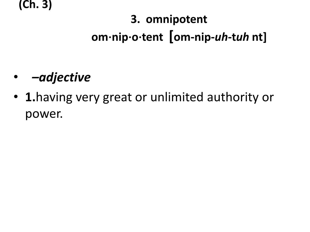 (Ch. 3) 3. omnipotentom⋅nip⋅o⋅tent[om-nip-uh-tuhnt] • –adjective • 1.having very great or unlimited authority or power.