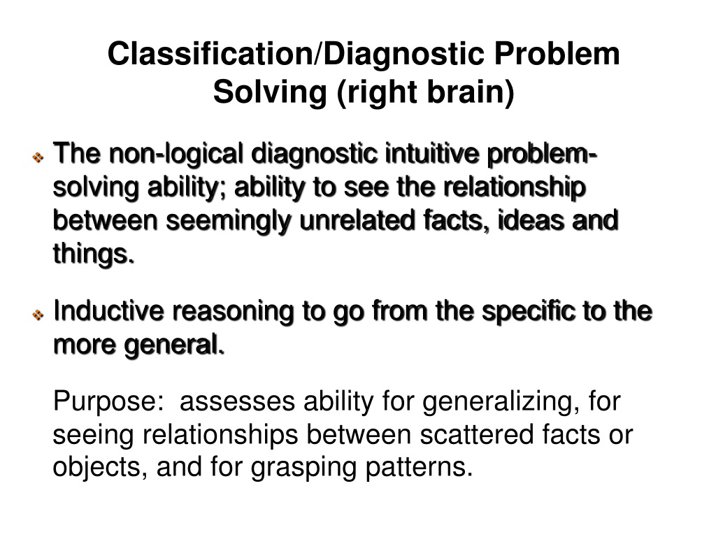 Classification/Diagnostic Problem Solving (right brain) • The non-logical diagnostic intuitive problem-solving ability; ability to see the relationship between seemingly unrelated facts, ideas and things. • Inductive reasoning to go from the specific to the more general. Purpose: assesses ability for generalizing, for seeing relationships between scattered facts or objects, and for grasping patterns.