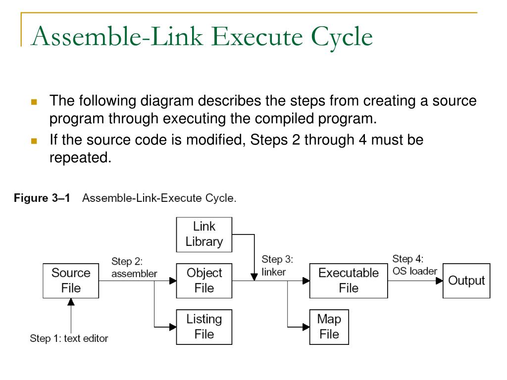 Assemble-Link Execute Cycle • The following diagram describes the steps from creating a source program through executing the compiled program. • If the source code is modified, Steps 2 through 4 must be repeated.