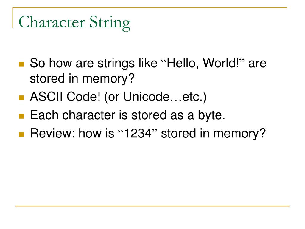 Character String • So how are strings like “Hello, World!” are stored in memory? • ASCII Code! (or Unicode…etc.) • Each character is stored as a byte. • Review: how is “1234” stored in memory?
