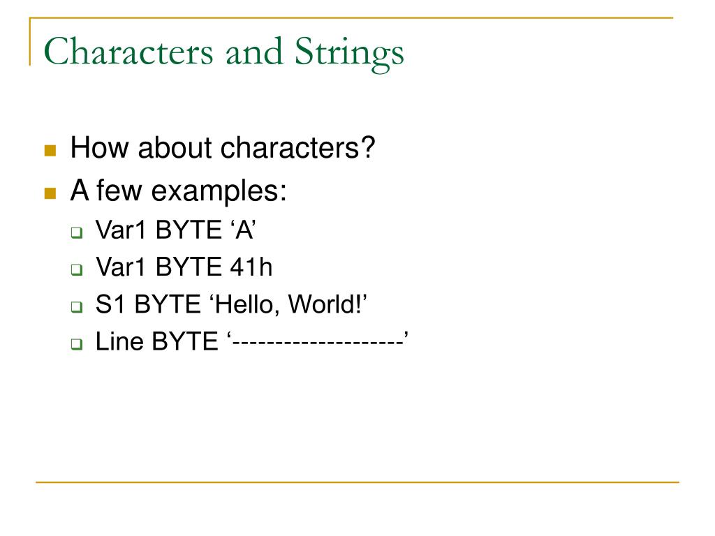 Characters and Strings • How about characters? • A few examples: • Var1 BYTE ‘A’ • Var1 BYTE 41h • S1 BYTE ‘Hello, World!’ • Line BYTE ‘--------------------’