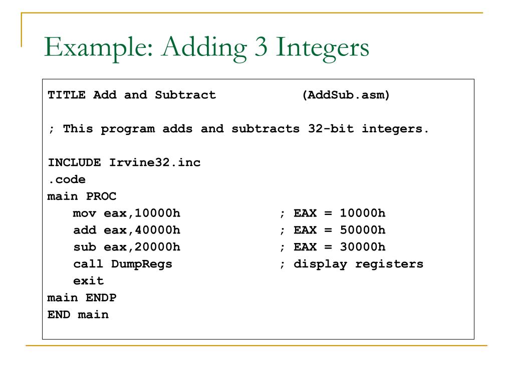 Example: Adding 3 Integers TITLE Add and Subtract (AddSub.asm) ; This program adds and subtracts 32-bit integers. INCLUDE Irvine32.inc .code main PROC mov eax,10000h ; EAX = 10000h add eax,40000h ; EAX = 50000h sub eax,20000h ; EAX = 30000h call DumpRegs ; display registers exit main ENDP END main