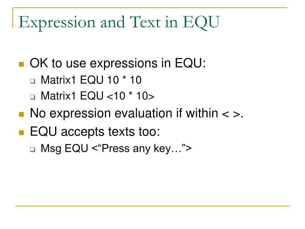 Expression and Text in EQU • OK to use expressions in EQU: • Matrix1 EQU 10 * 10 • Matrix1 EQU <10 * 10> • No expression evaluation if within < >. • EQU accepts texts too: • Msg EQU <“Press any key…”>