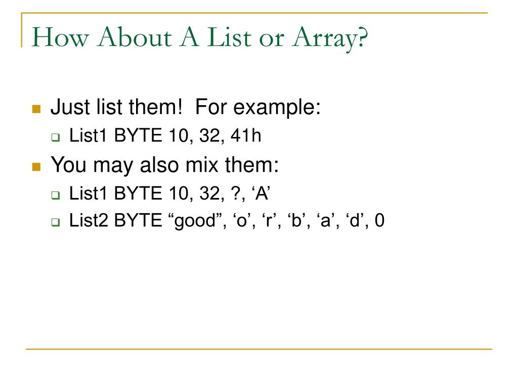 How About A List or Array? • Just list them! For example: • List1 BYTE 10, 32, 41h • You may also mix them: • List1 BYTE 10, 32, ?, ‘A’ • List2 BYTE “good”, ‘o’, ‘r’, ‘b’, ‘a’, ‘d’, 0