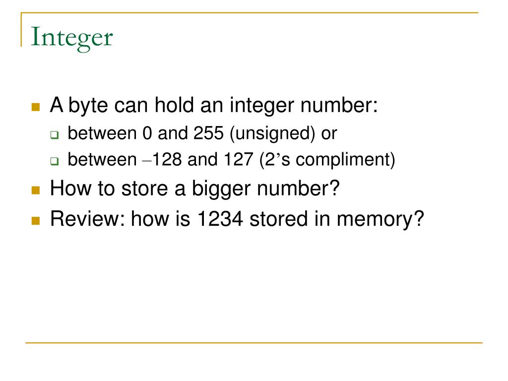 Integer • A byte can hold an integer number: • between 0 and 255 (unsigned) or • between –128 and 127 (2’s compliment) • How to store a bigger number? • Review: how is 1234 stored in memory?