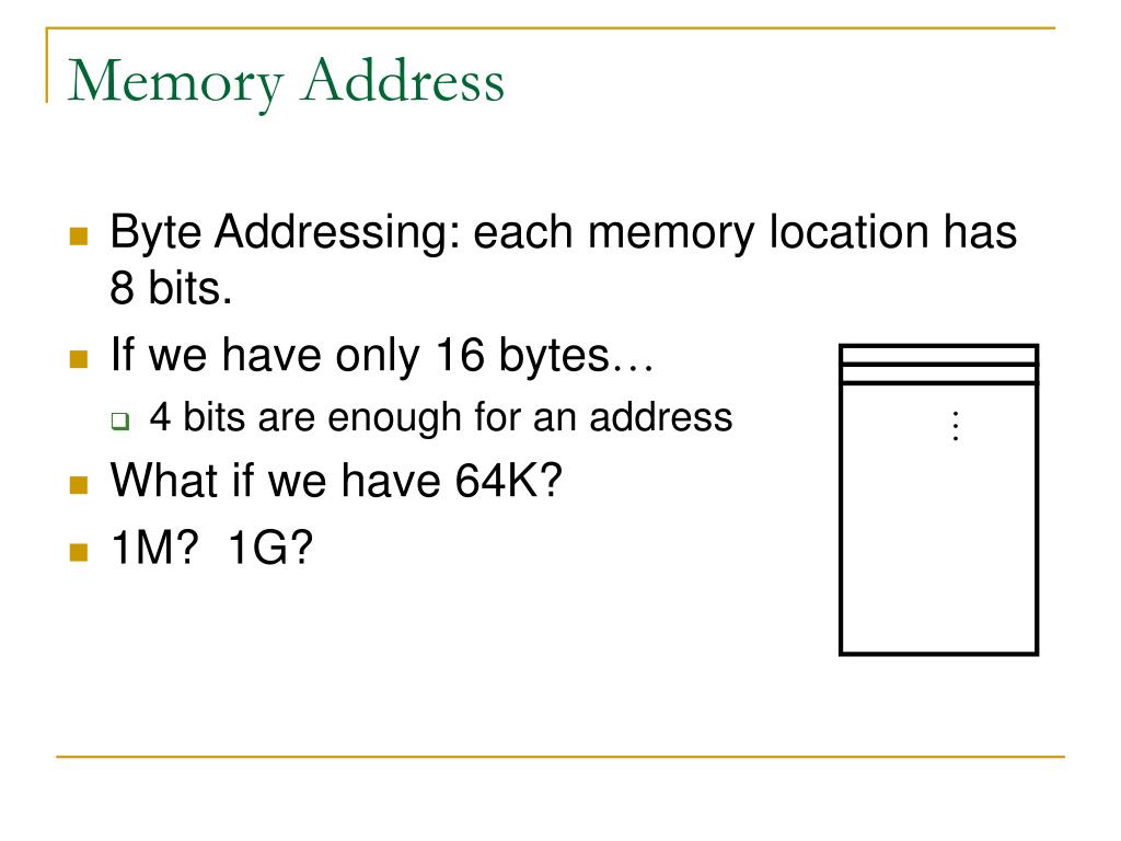 Memory Address • Byte Addressing: each memory location has 8 bits. • If we have only 16 bytes… • 4 bits are enough for an address • What if we have 64K? • 1M? 1G? …