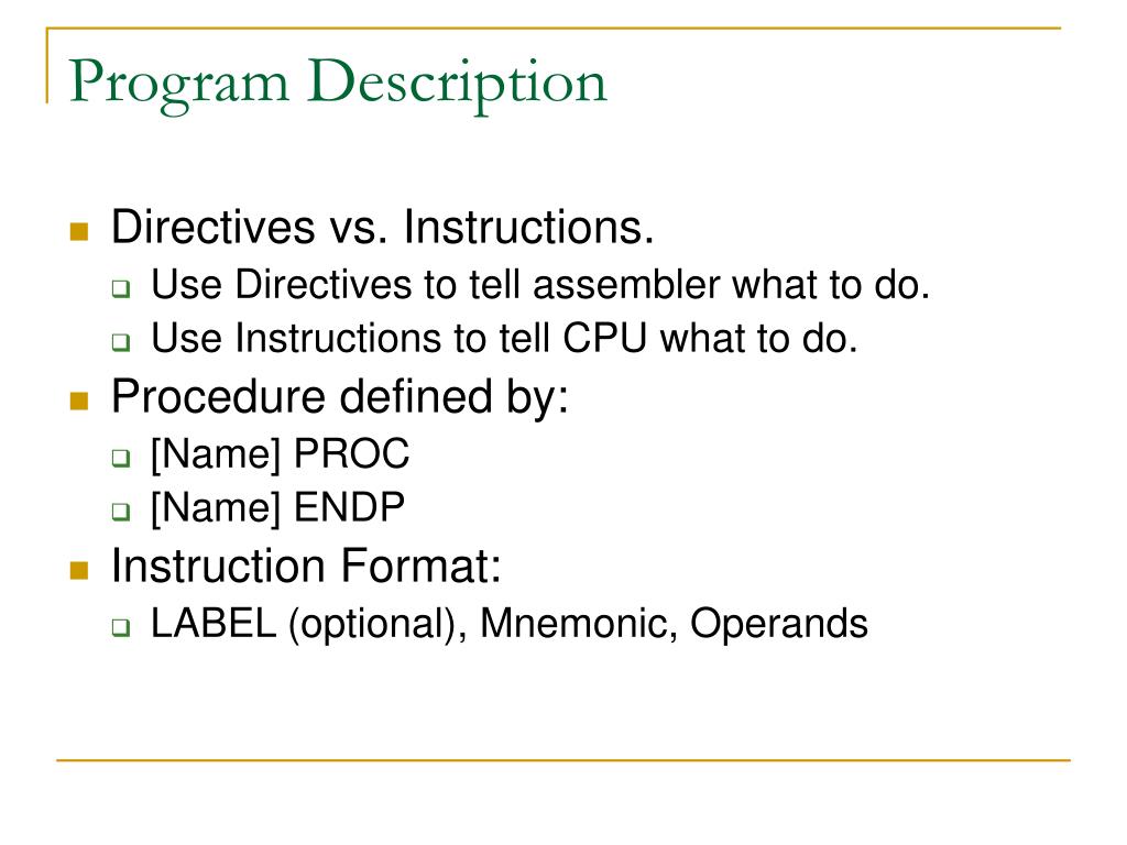 Program Description • Directives vs. Instructions. • Use Directives to tell assembler what to do. • Use Instructions to tell CPU what to do. • Procedure defined by: • [Name] PROC • [Name] ENDP • Instruction Format: • LABEL (optional), Mnemonic, Operands