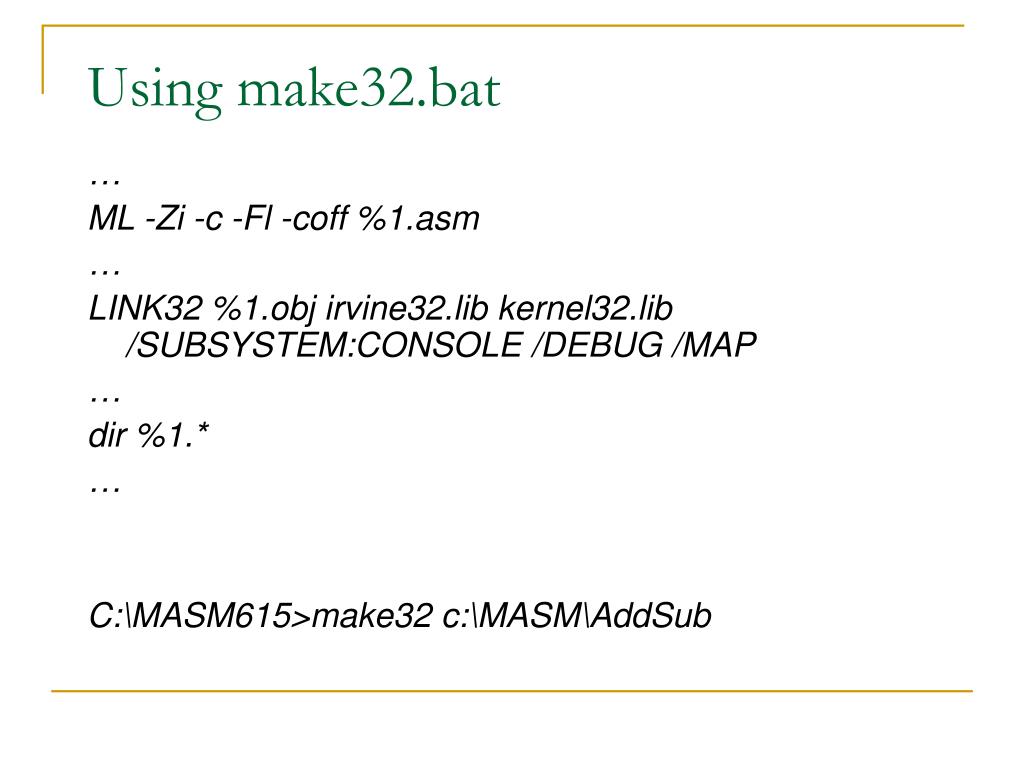 Using make32.bat … ML -Zi -c -Fl -coff %1.asm … LINK32 %1.obj irvine32.lib kernel32.lib /SUBSYSTEM:CONSOLE /DEBUG /MAP … dir %1.* … C:\MASM615>make32 c:\MASM\AddSub