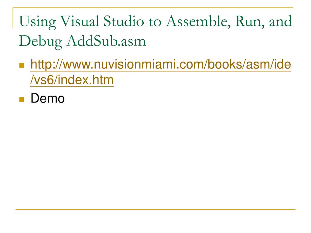 Using Visual Studio to Assemble, Run, and Debug AddSub.asm • http://www.nuvisionmiami.com/books/asm/ide/vs6/index.htm • Demo