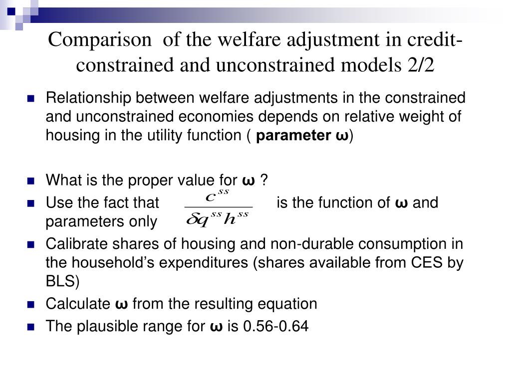 Comparison of the welfare adjustment in credit-constrained and unconstrained models 2/2 • Relationship between welfare adjustments in the constrained and unconstrained economies depends on relative weight of housing in the utility function ( parameter ω) • What is the proper value for ω ? • Use the fact that is the function of ω and parameters only • Calibrate shares of housing and non-durable consumption in the household’s expenditures (shares available from CES by BLS) • Calculate ω from the resulting equation • The plausible range for ω is 0.56-0.64