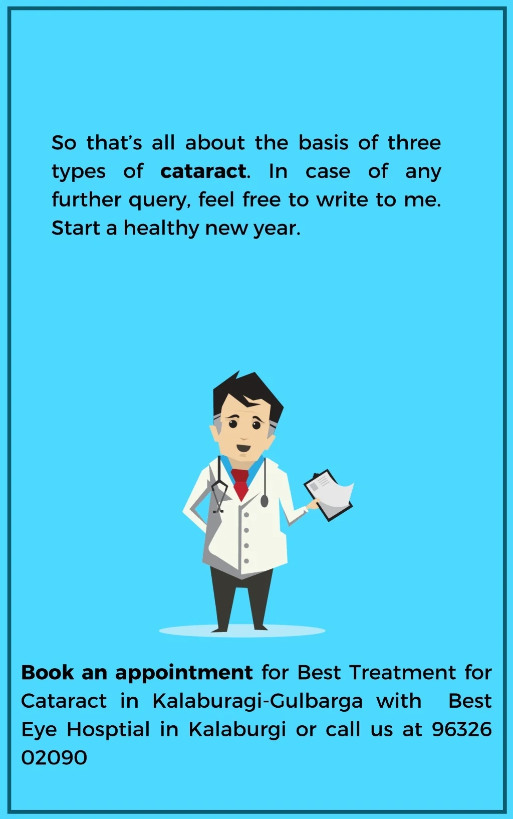 Sothat’sallaboutthebasisofthree typesofcataract. Incaseofany furtherquery, feelfreetowritetome. Startahealthynewyear. BookanappointmentforBestTreatmentfor CataractinKalaburagi-GulbargawithBest EyeHosptialinKalaburgiorcallusat96326 02090