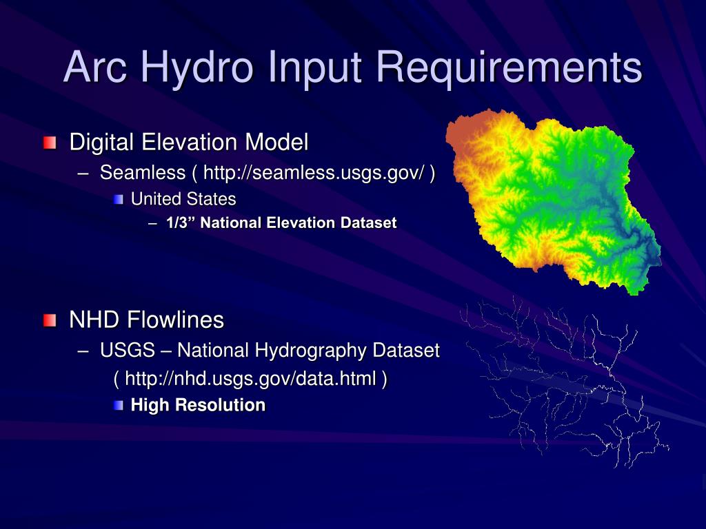 Arc Hydro Input Requirements • Digital Elevation Model • Seamless ( http://seamless.usgs.gov/ ) • United States • 1/3” National Elevation Dataset • NHD Flowlines • USGS – National Hydrography Dataset ( http://nhd.usgs.gov/data.html ) • High Resolution