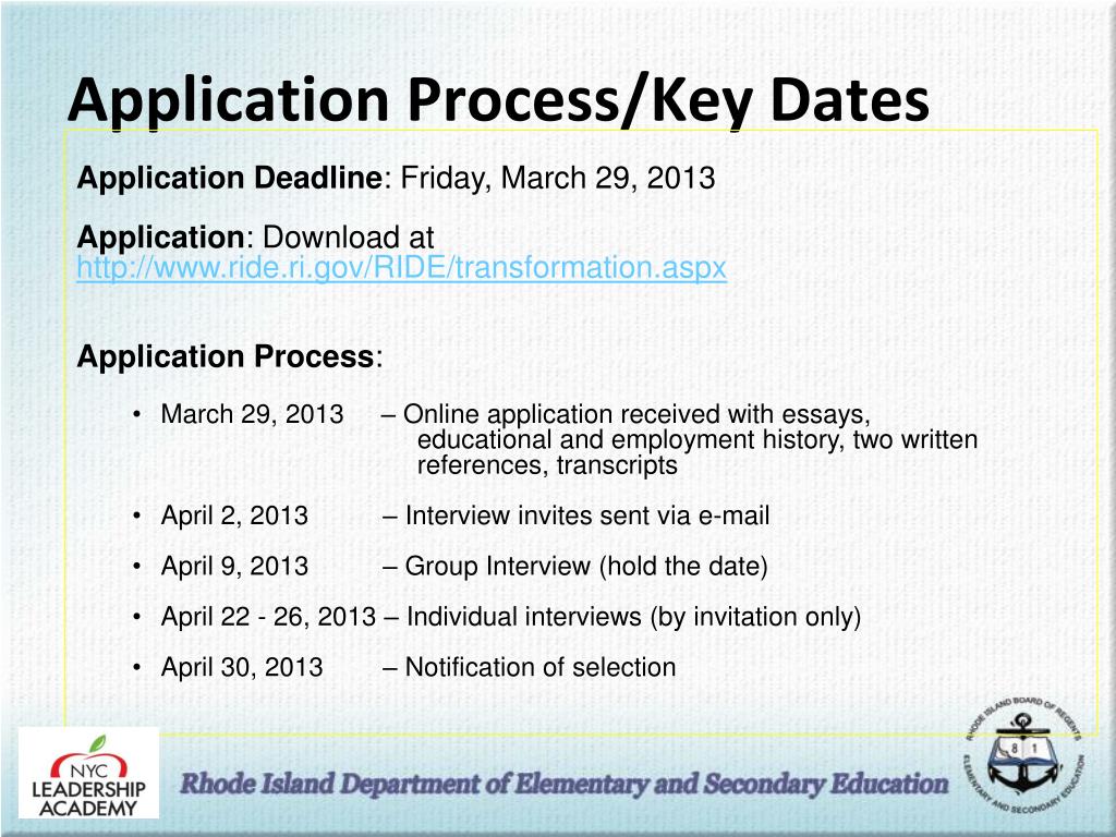 Application Process/Key Dates • Application Deadline: Friday, March 29, 2013 • Application: Download at http://www.ride.ri.gov/RIDE/transformation.aspx • Application Process: • March 29, 2013 – Online application received with essays, educational and employment history, two written references, transcripts • April 2, 2013 – Interview invites sent via e-mail • April 9, 2013 – Group Interview (hold the date) • April 22 - 26, 2013 – Individual interviews (by invitation only) • April 30, 2013 – Notification of selection