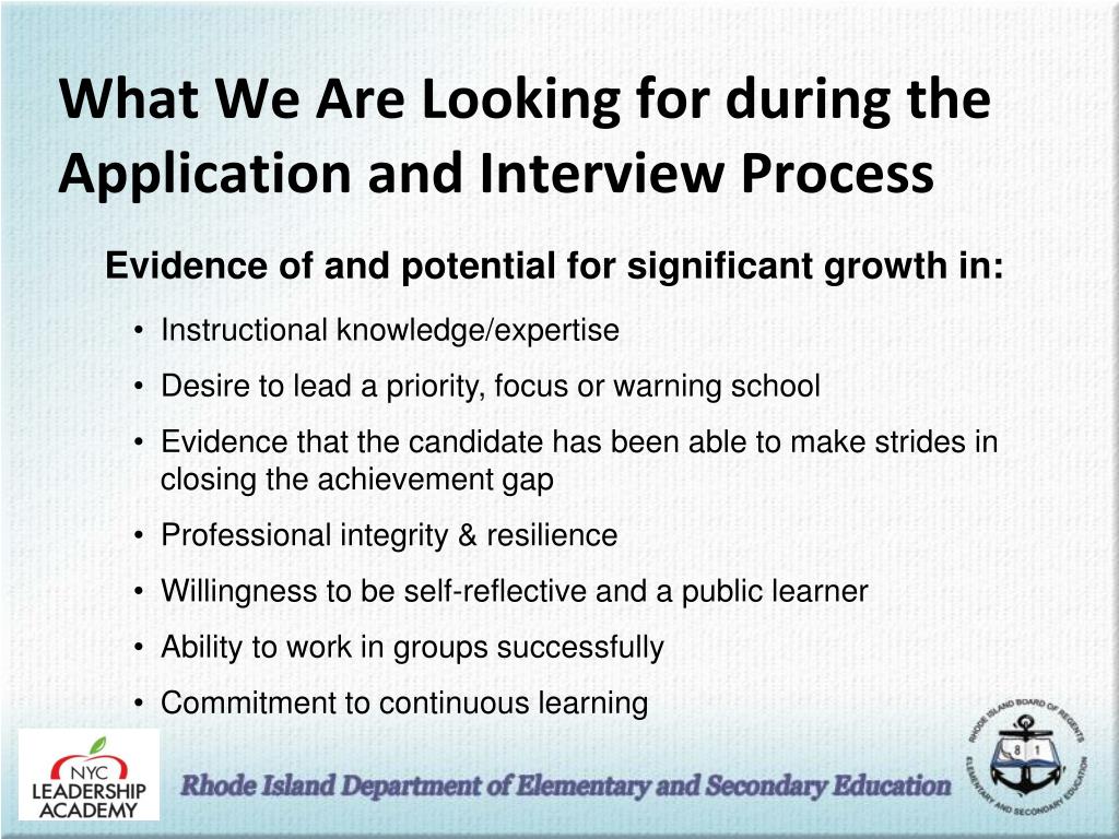 What We Are Looking for during the Application and Interview Process • Evidence of and potential for significant growth in: • Instructional knowledge/expertise • Desire to lead a priority, focus or warning school • Evidence that the candidate has been able to make strides inclosing the achievement gap • Professional integrity & resilience • Willingness to be self-reflective and a public learner • Ability to work in groups successfully • Commitment to continuous learning