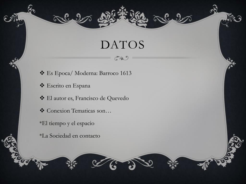 Datos • Es Epoca/ Moderna: Barroco 1613 • Escrito en Espana • El autor es, Francisco de Quevedo • ConexionTematicas son… *El tiempo y el espacio *La Sociedad en contacto