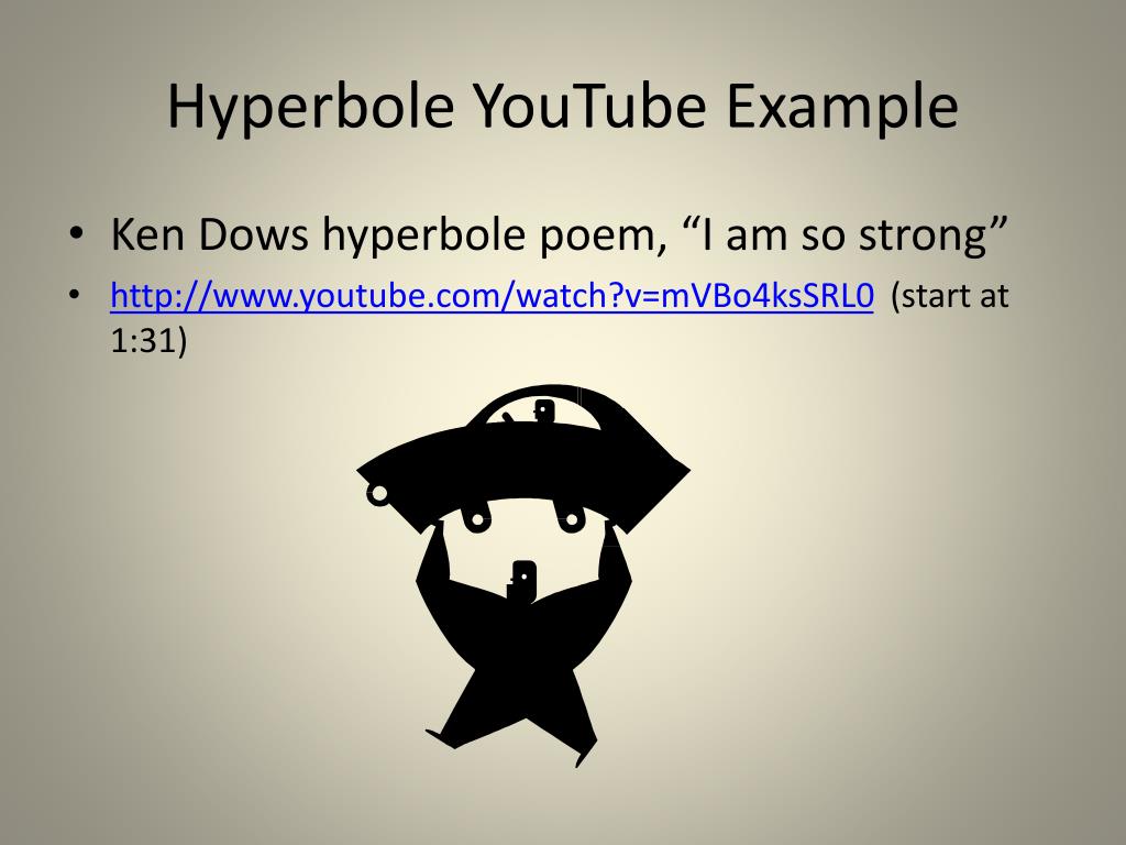 Hyperbole YouTube Example • Ken Dows hyperbole poem, “I am so strong” • http://www.youtube.com/watch?v=mVBo4ksSRL0 (start at 1:31)
