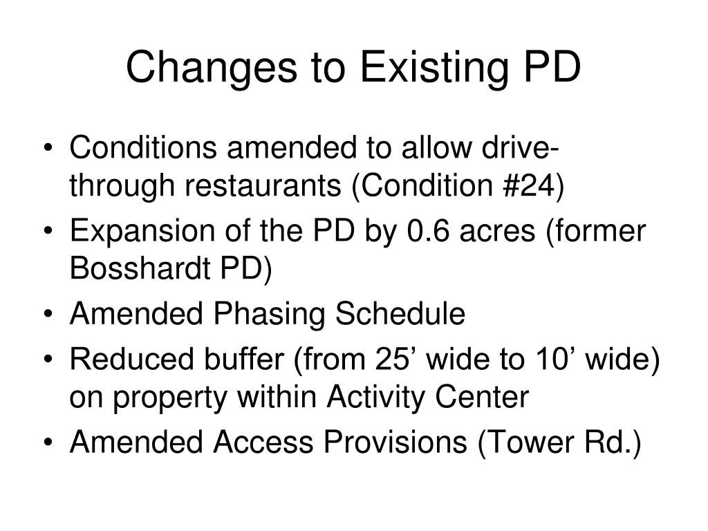 Changes to Existing PD • Conditions amended to allow drive-through restaurants (Condition #24) • Expansion of the PD by 0.6 acres (former Bosshardt PD) • Amended Phasing Schedule • Reduced buffer (from 25’ wide to 10’ wide) on property within Activity Center • Amended Access Provisions (Tower Rd.)