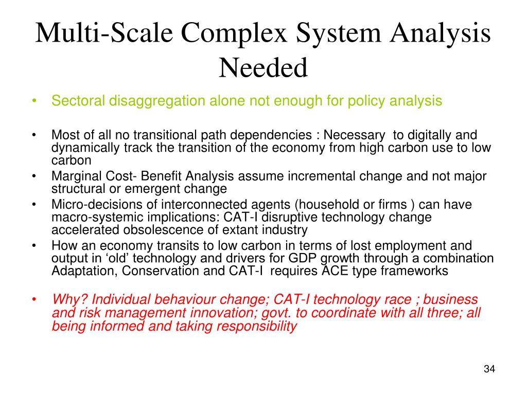 Multi-Scale Complex System Analysis Needed • Sectoral disaggregation alone not enough for policy analysis • Most of all no transitional path dependencies : Necessary to digitally and dynamically track the transition of the economy from high carbon use to low carbon • Marginal Cost- Benefit Analysis assume incremental change and not major structural or emergent change • Micro-decisions of interconnected agents (household or firms ) can have macro-systemic implications: CAT-I disruptive technology change accelerated obsolescence of extant industry • How an economy transits to low carbon in terms of lost employment and output in ‘old’ technology and drivers for GDP growth through a combination Adaptation, Conservation and CAT-I requires ACE type frameworks • Why? Individual behaviour change; CAT-I technology race ; business and risk management innovation; govt. to coordinate with all three; all being informed and taking responsibility