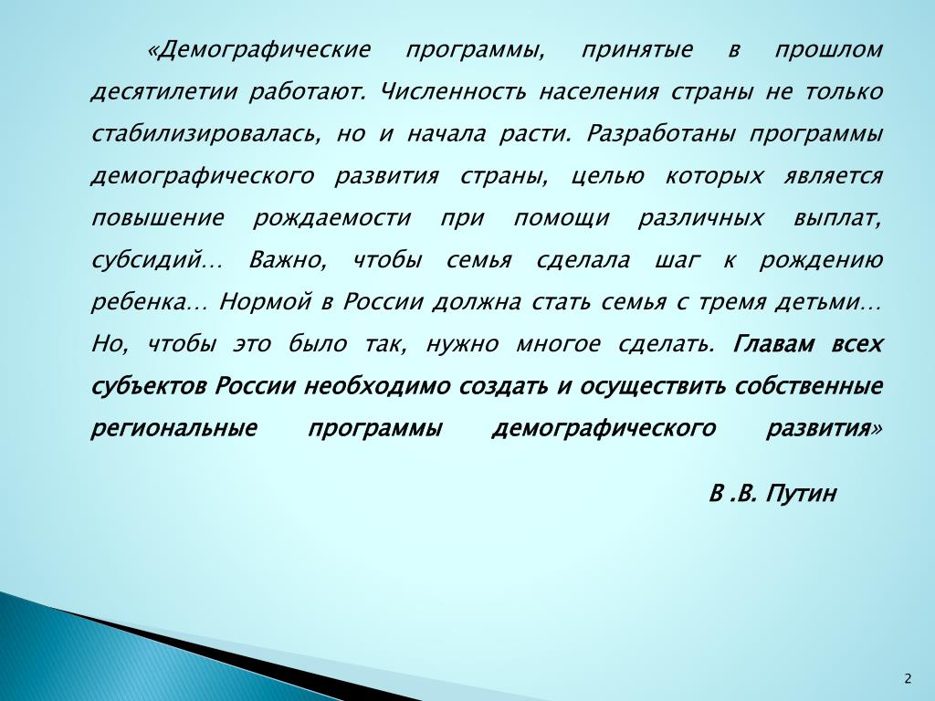 «Демографические программы, принятые в прошлом десятилетии работают. Численность населения страны не только стабилизировалась, но и начала расти. Разработаны программы демографического развития страны, целью которых является повышение рождаемости при помощи различных выплат, субсидий… Важно, чтобы семья сделала шаг к рождению ребенка… Нормой в России должна стать семья с тремя детьми… Но, чтобы это было так, нужно многое сделать. Главам всех субъектов России необходимо создать и осуществить собственные региональные программы демографического развития»В .В. Путин