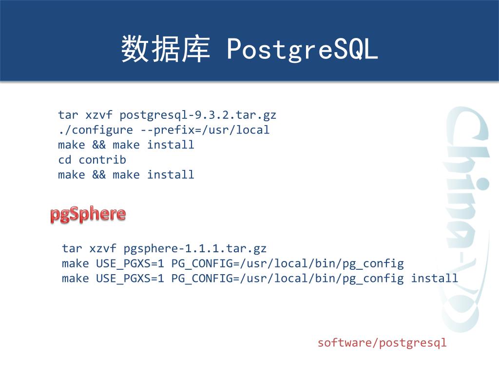 数据库PostgreSQL tar xzvf postgresql-9.3.2.tar.gz ./configure --prefix=/usr/local make && make install cd contrib make && make install pgSphere tar xzvf pgsphere-1.1.1.tar.gz make USE_PGXS=1 PG_CONFIG=/usr/local/bin/pg_config make USE_PGXS=1 PG_CONFIG=/usr/local/bin/pg_config install software/postgresql