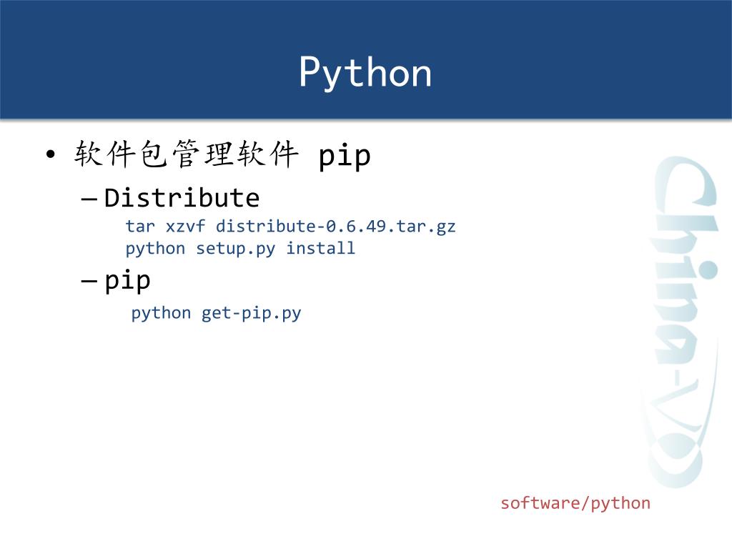 Python • 软件包管理软件 pip • Distribute • pip tar xzvf distribute-0.6.49.tar.gz python setup.py install python get-pip.py software/python