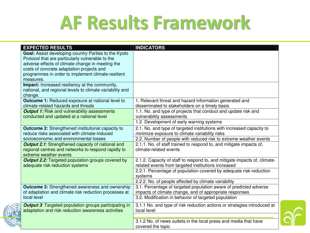 Financing criteria • Funding provided on full adaptation costs basis of projects and programmes to address the adverse effects of climate change • AF will finance projects/programmes whose principal and explicit aim is to adapt and increase climate resilience • Projects/programmes have to be concrete: discussion on definition on-going