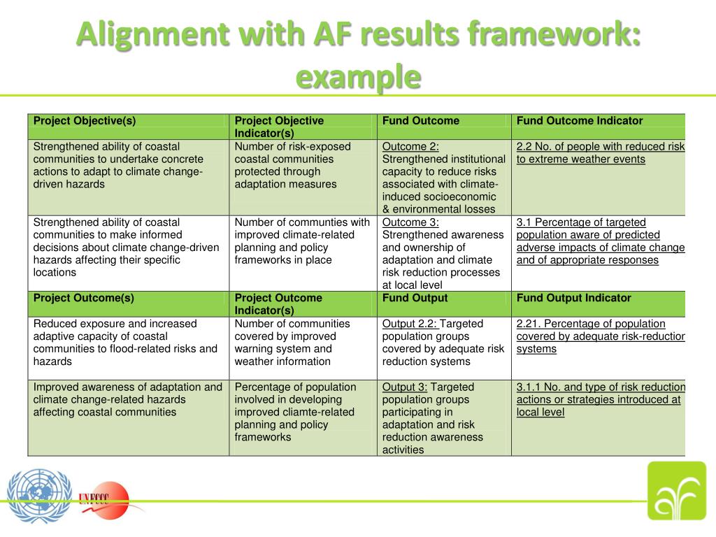 Important steps in project development • Acquiring adequate information about the adaptation challenge and other factors • Ensuring alignment with national strategies and plans • Avoiding overlap with other similar projects • Ensuring alignment with AF results framework • Adequate consultations with vulnerable communities and women (for full proposal)
