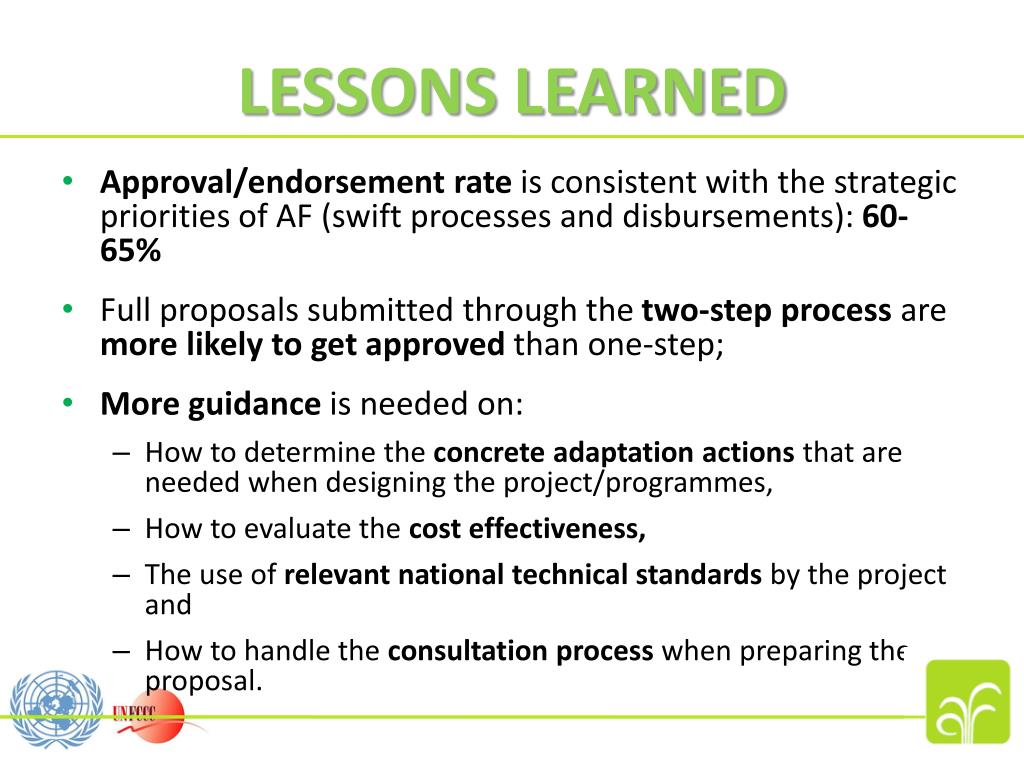 LESSONS LEARNED • Approval/endorsement rate is consistent with the strategic priorities of AF (swift processes and disbursements): 60-65% • Full proposals submitted through the two-step process are more likely to get approved than one-step; • More guidance is needed on: • How to determine the concrete adaptation actions that are needed when designing the project/programmes, • How to evaluate the cost effectiveness, • The use of relevant national technical standards by the project and • How to handle the consultation process when preparing the proposal.