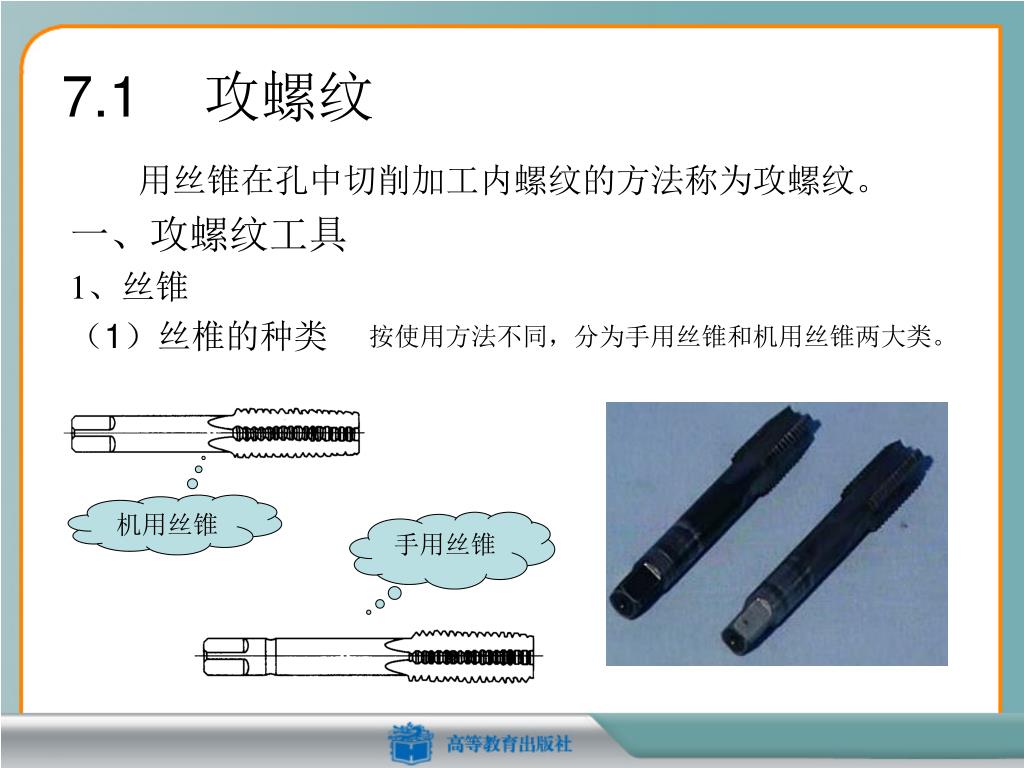 7.1 攻螺纹 用丝锥在孔中切削加工内螺纹的方法称为攻螺纹。 一、攻螺纹工具 1、丝锥 (1)丝椎的种类 按使用方法不同,分为手用丝锥和机用丝锥两大类。 机用丝锥 手用丝锥