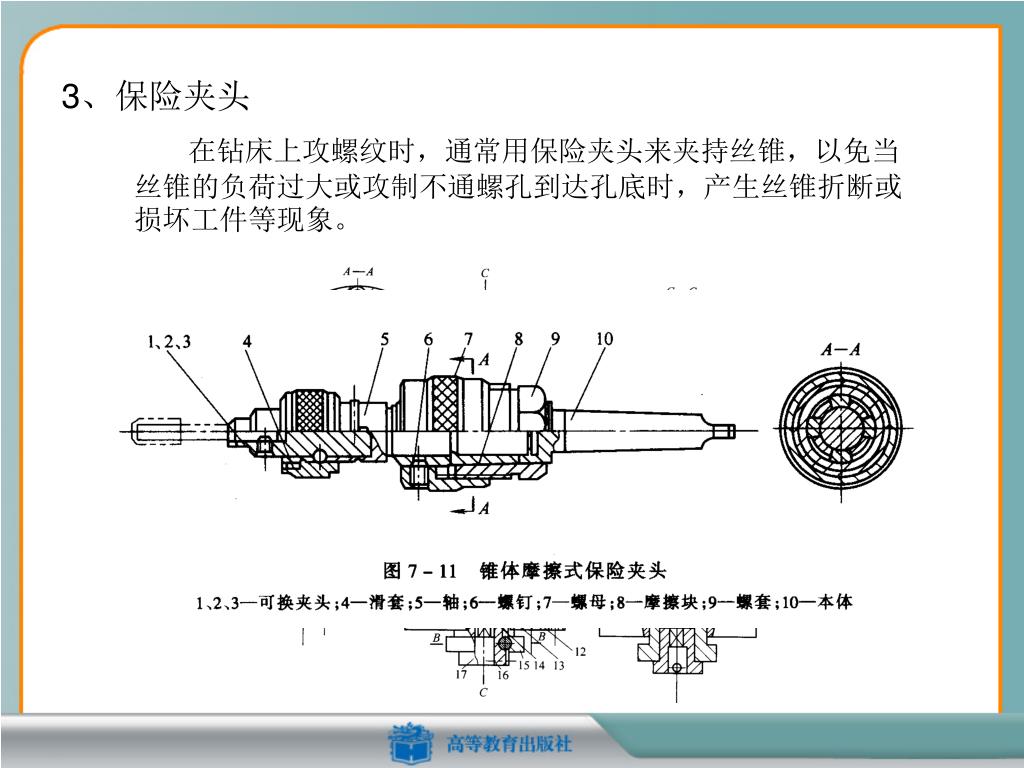 3、保险夹头 在钻床上攻螺纹时,通常用保险夹头来夹持丝锥,以免当丝锥的负荷过大或攻制不通螺孔到达孔底时,产生丝锥折断或损坏工件等现象。