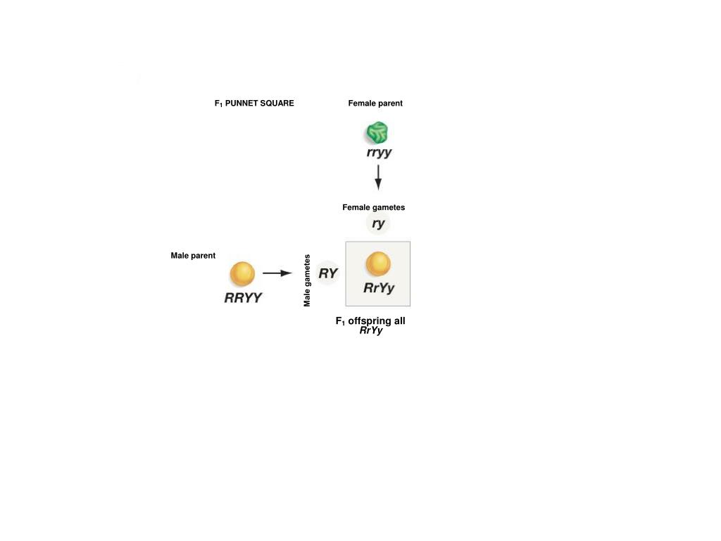 Hypothesis of independent assortment: Alleles of different genes don’t stay together when gametes form. F1 PUNNET SQUARE Female parent Female gametes Male parent Male gametes F1 offspring all RrYy X F2 male parent Male gametes F2 offspring genotypes: 9/16 R–Y– : 3/16 R–yy : 3/16 rrY– : 1/16 rryy F2 offspring phenotypes: 9/16 : 3/16 : 3/16 : 1/16