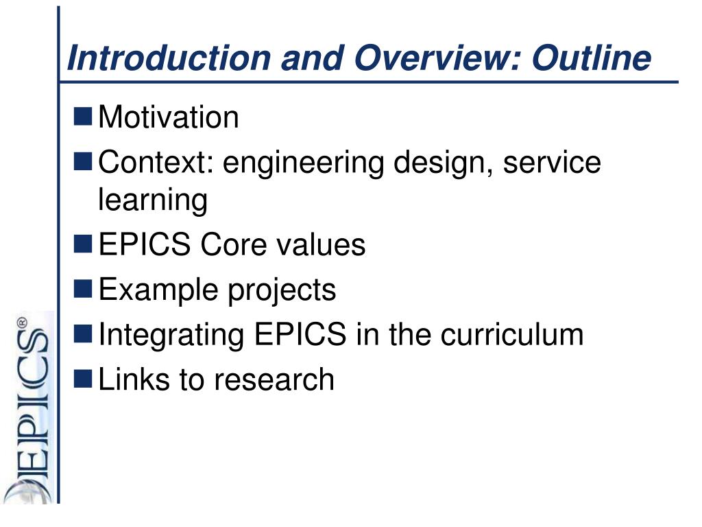 Introduction and Overview: Outline • Motivation • Context: engineering design, service learning • EPICS Core values • Example projects • Integrating EPICS in the curriculum • Links to research