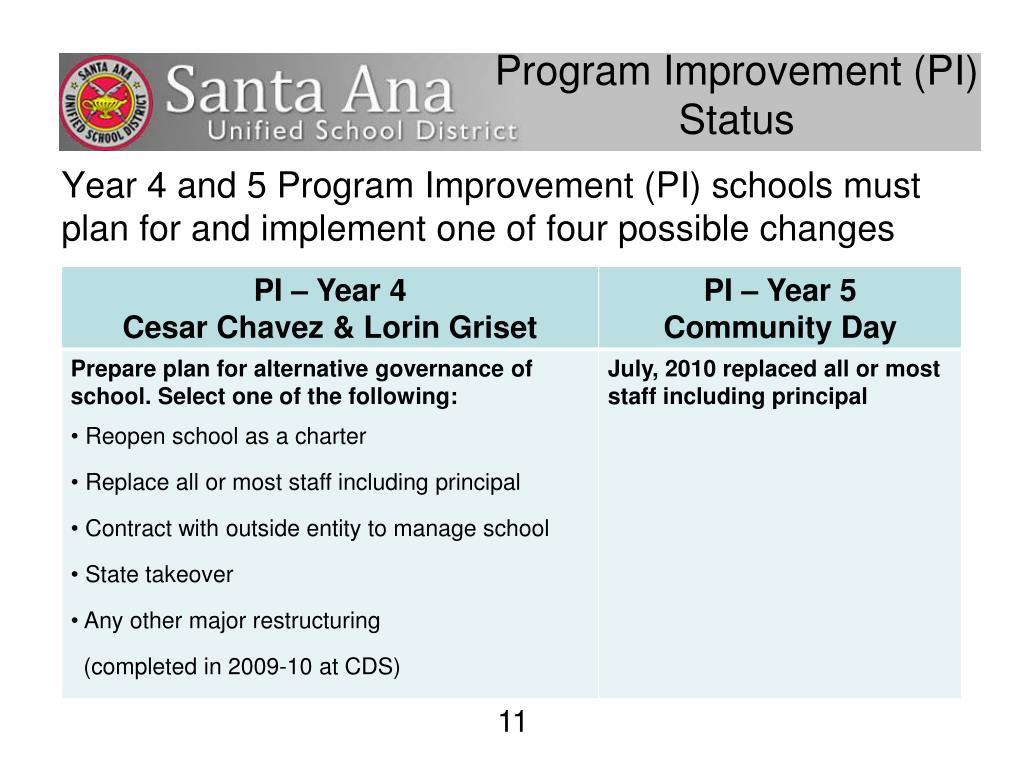 Program Improvement (PI) Status Year 4 and 5 Program Improvement (PI) schools must plan for and implement one of four possible changes
