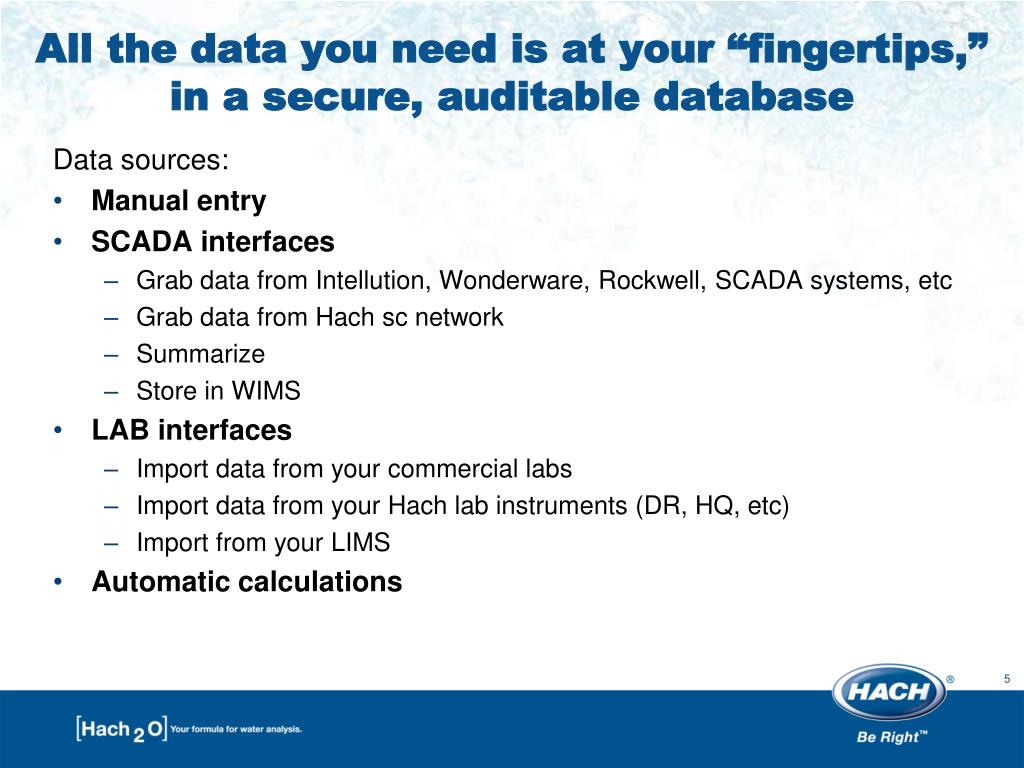 All the data you need is at your “fingertips,” in a secure, auditable database Data sources: Manual entry SCADA interfaces Grab data from Intellution, Wonderware, Rockwell, SCADA systems, etc Grab data from Hach sc network Summarize Store in WIMS LAB interfaces Import data from your commercial labs Import data from your Hach lab instruments (DR, HQ, etc) Import from your LIMS Automatic calculations
