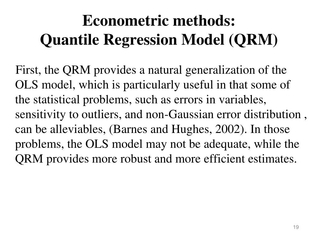 Econometric methods:Quantile Regression Model (QRM) First, the QRM provides a natural generalization of the OLS model, which is particularly useful in that some of the statistical problems, such as errors in variables, sensitivity to outliers, and non-Gaussian error distribution , can be alleviables, (Barnes and Hughes, 2002). In those problems, the OLS model may not be adequate, while the QRM provides more robust and more efficient estimates. 19