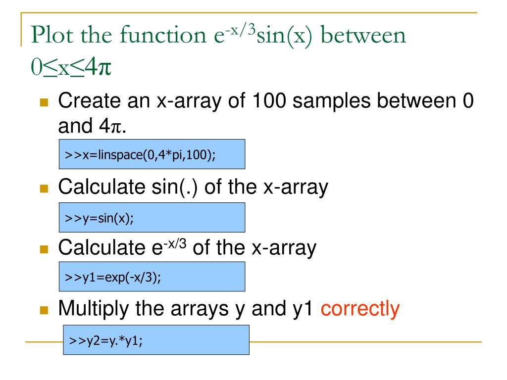 Plot the function e-x/3sin(x) between 0≤x≤4π • Create an x-array of 100 samples between 0 and 4π. • Calculate sin(.) of the x-array • Calculate e-x/3 of the x-array • Multiply the arrays y and y1 correctly >>x=linspace(0,4*pi,100); >>y=sin(x); >>y1=exp(-x/3); >>y2=y.*y1;