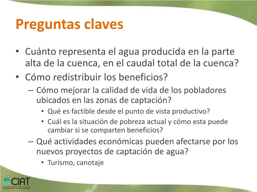 Preguntas claves • Cuánto representa el agua producida en la parte alta de la cuenca, en el caudal total de la cuenca? • Cómo redistribuir los beneficios? • Cómo mejorar la calidad de vida de los pobladores ubicados en las zonas de captación? • Qué es factible desde el punto de vista productivo? • Cuál es la situación de pobreza actual y cómo esta puede cambiar si se comparten beneficios? • Qué actividades económicas pueden afectarse por los nuevos proyectos de captación de agua? • Turismo, canotaje