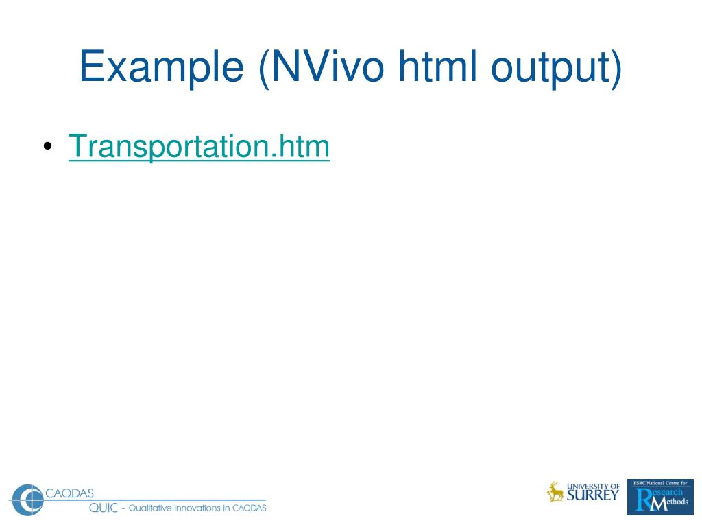 Output options • CAQDAS packages not editing tools • Graphic co-ordinates • Time references • Partial workaround • NVivo html output (but only for directly coded references)