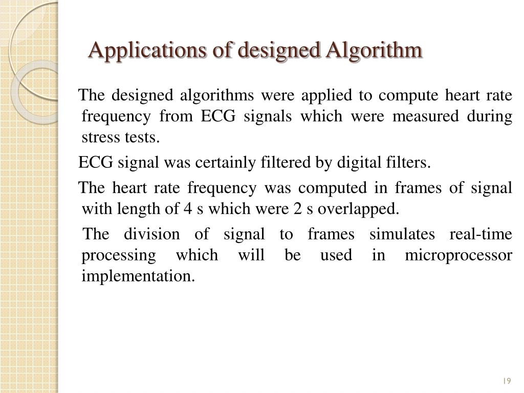 Applications of designed Algorithm The designed algorithms were applied to compute heart rate frequency from ECG signals which were measured during stress tests. ECG signal was certainly filtered by digital filters. The heart rate frequency was computed in frames of signal with length of 4 s which were 2 s overlapped. The division of signal to frames simulates real-time processing which will be used in microprocessor implementation.