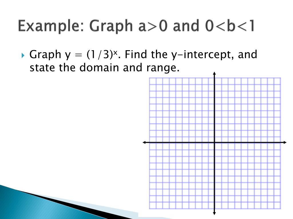 Example: Graph a>0 and 0<b<1 • Graph y = (1/3)x. Find the y-intercept, and state the domain and range.