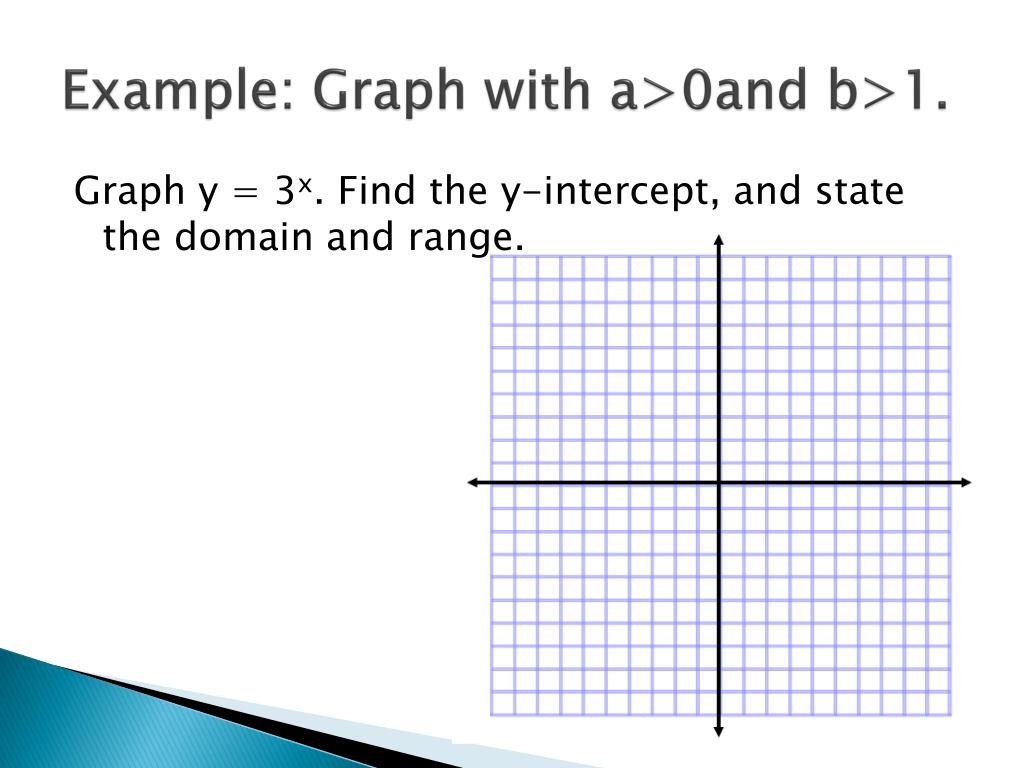 Example: Graph with a>0and b>1. Graph y = 3x. Find the y-intercept, and state the domain and range.