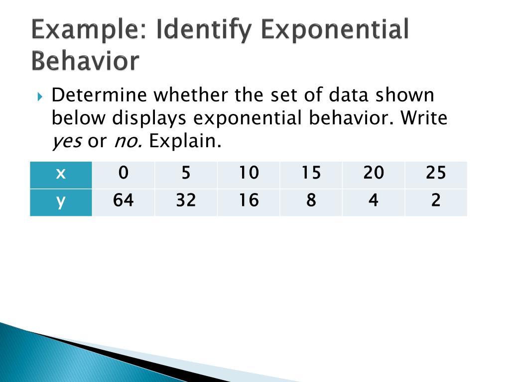 Example: Identify Exponential Behavior • Determine whether the set of data shown below displays exponential behavior. Write yes or no. Explain.