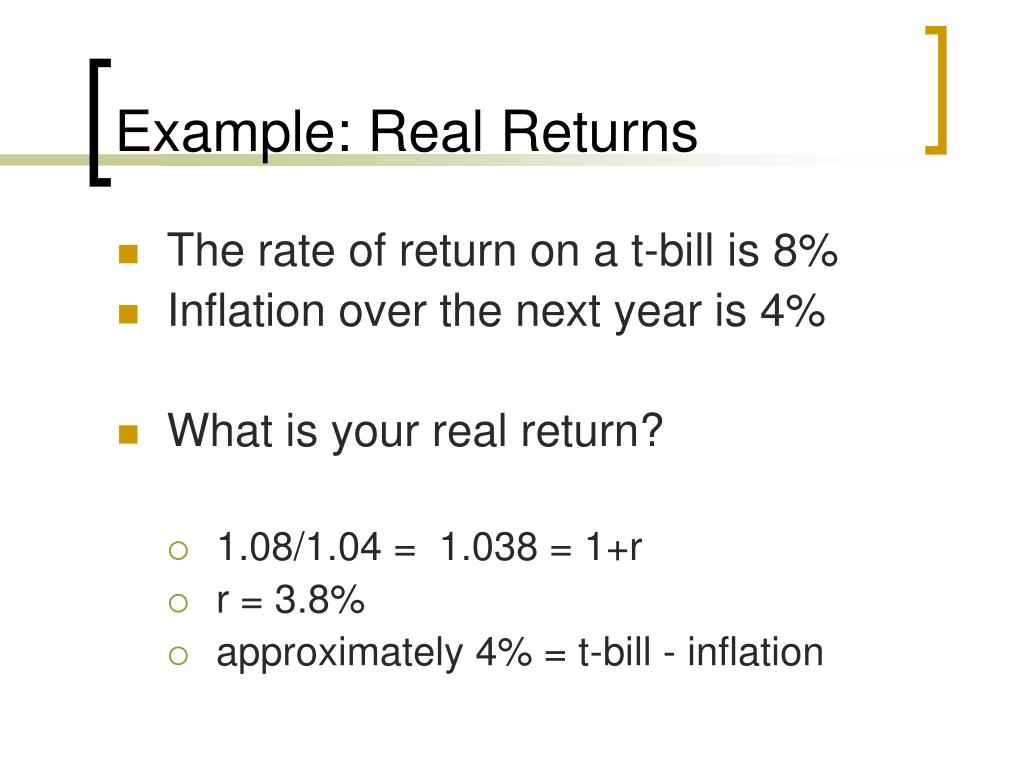 Example: Real Returns • The rate of return on a t-bill is 8% • Inflation over the next year is 4% • What is your real return? • 1.08/1.04 = 1.038 = 1+r • r = 3.8% • approximately 4% = t-bill - inflation