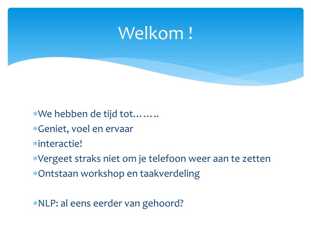 Welkom ! We hebben de tijd tot…….. Geniet, voel en ervaar interactie! Vergeet straks niet om je telefoon weer aan te zetten Ontstaan workshop en taakverdeling NLP: al eens eerder van gehoord?