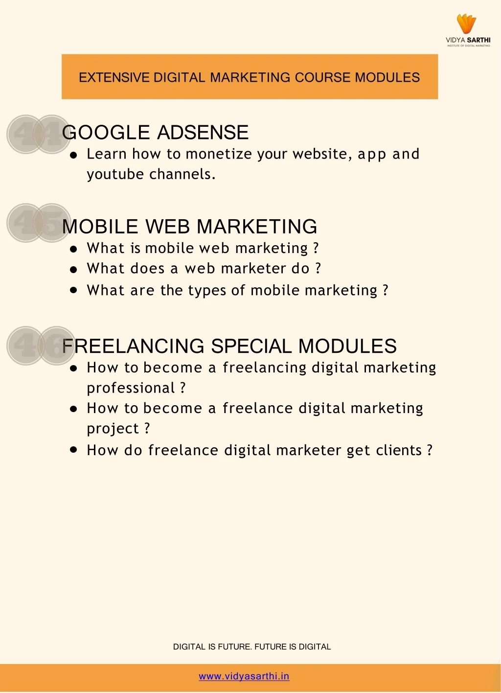 EXTENSIVEDIGITALMARKETINGCOURSEMODULES GOOGLEADSENSE Learnhowtomonetizeyourwebsite,appand youtubechannels. MOBILEWEBMARKETING Whatismobilewebmarketing? Whatdoesawebmarketerdo? Whatarethetypesofmobilemarketing? FREELANCINGSPECIALMODULES Howtobecomeafreelancingdigitalmarketing professional? Howtobecomeafreelancedigitalmarketing project? Howdofreelancedigitalmarketergetclients? DIGITALISFUTURE.FUTUREISDIGITAL www.vidyasarthi.in