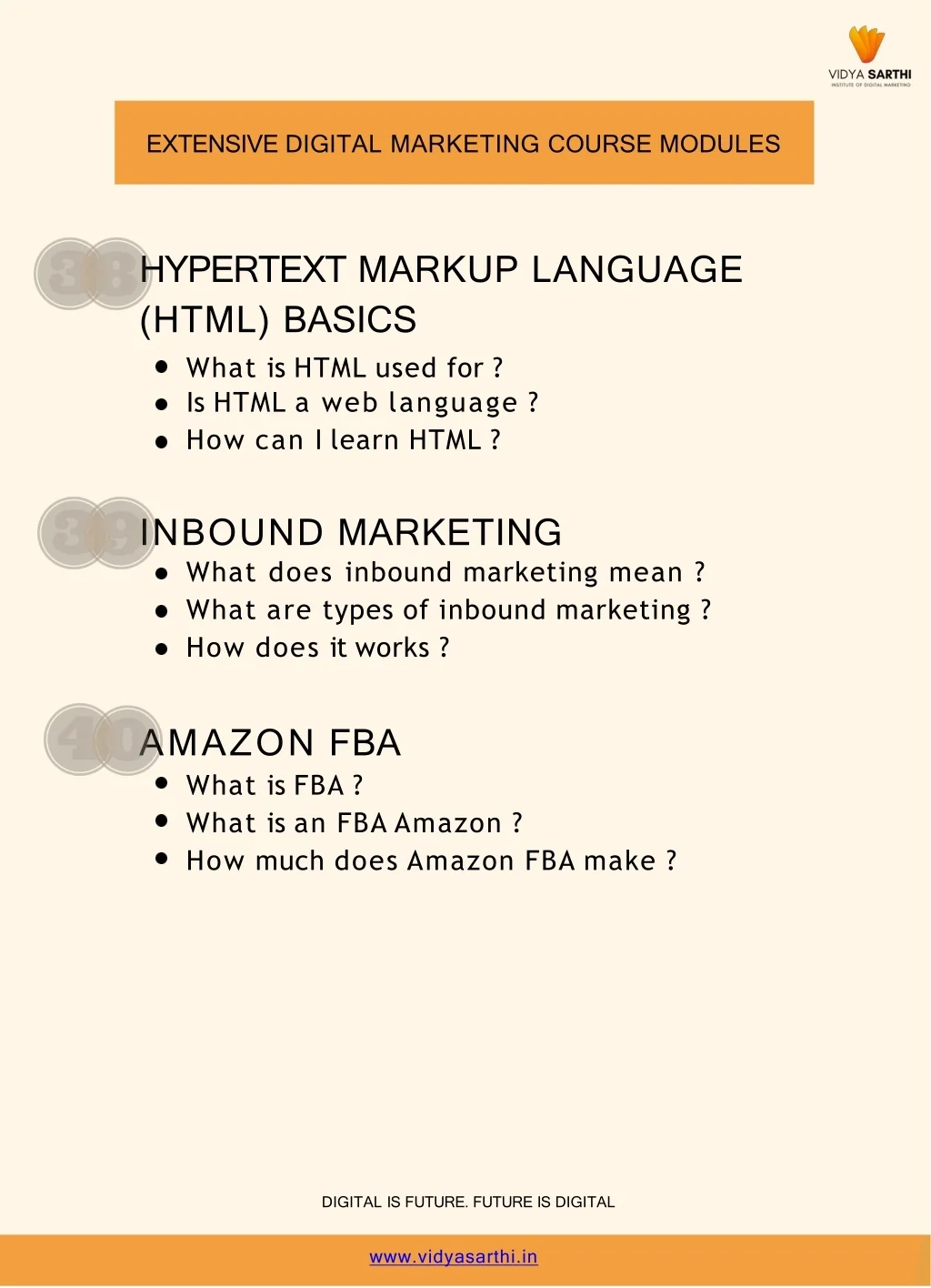 EXTENSIVEDIGITALMARKETINGCOURSEMODULES HYPERTEXTMARKUPLANGUAGE (HTML)BASICS WhatisHTMLusedfor? IsHTMLaweblanguage? HowcanIlearnHTML? INBOUNDMARKETING What does inbound marketing mean ? Whataretypesofinboundmarketing? Howdoesitworks? AMAZONFBA WhatisFBA? WhatisanFBAAmazon? HowmuchdoesAmazonFBAmake? DIGITALISFUTURE.FUTUREISDIGITAL www.vidyasarthi.in