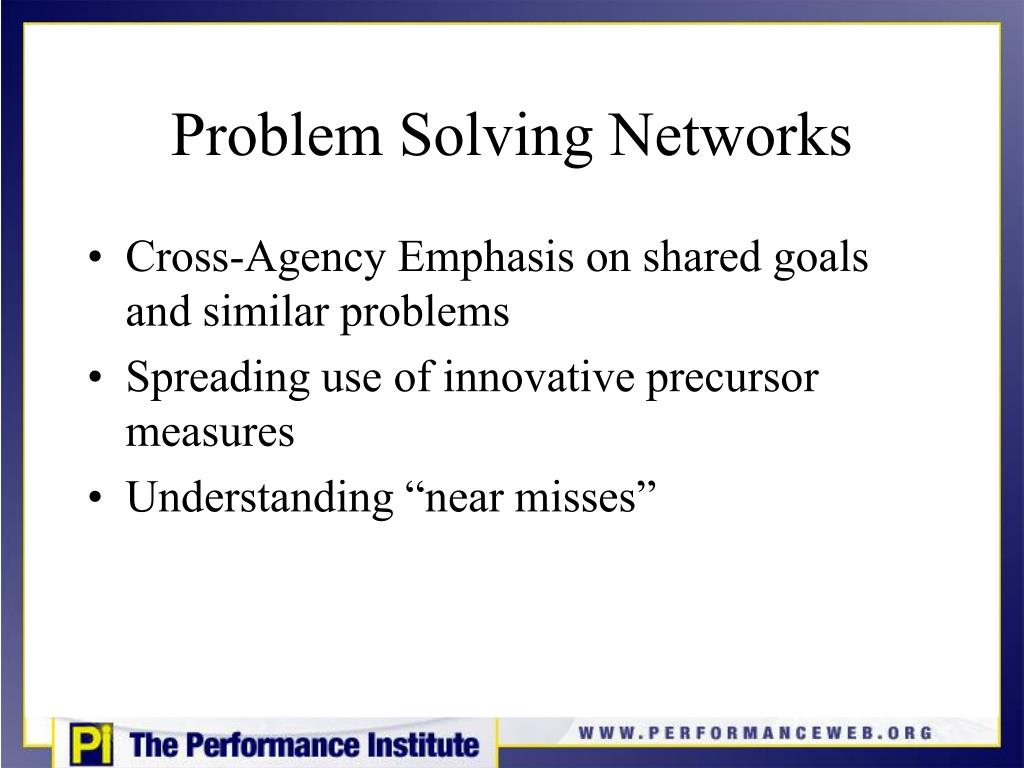 Problem Solving Networks • Cross-Agency Emphasis on shared goals and similar problems • Spreading use of innovative precursor measures • Understanding “near misses”